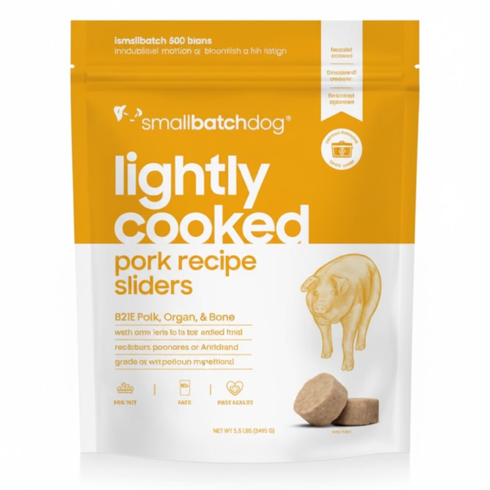 Small Batch Frozen Lightly Cooked Pork, 5lbs Our premium frozen pork is gently lightly cooked to preserve nutritional integrity while eliminating pathogens, making it an ideal protein source for raw or whole food diets. Each 5lb batch is sourced from carefully selected suppliers and flash-frozen at peak freshness to lock in quality. The lightly cooked preparation method maintains the meat's natural composition without excessive processing, offering a balanced alternative for discerning pet owners seeking minimally processed nutrition. Thaw and serve directly, or incorporate into your pet's existing diet. Perfect for dogs and cats requiring high-quality, traceable protein sources.